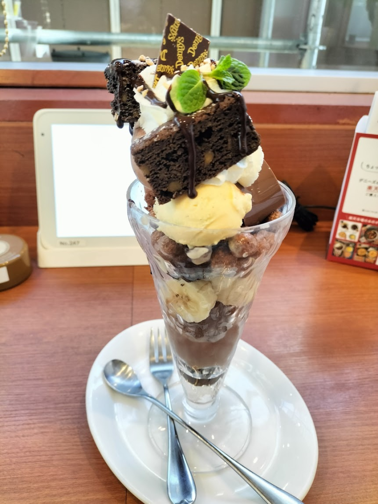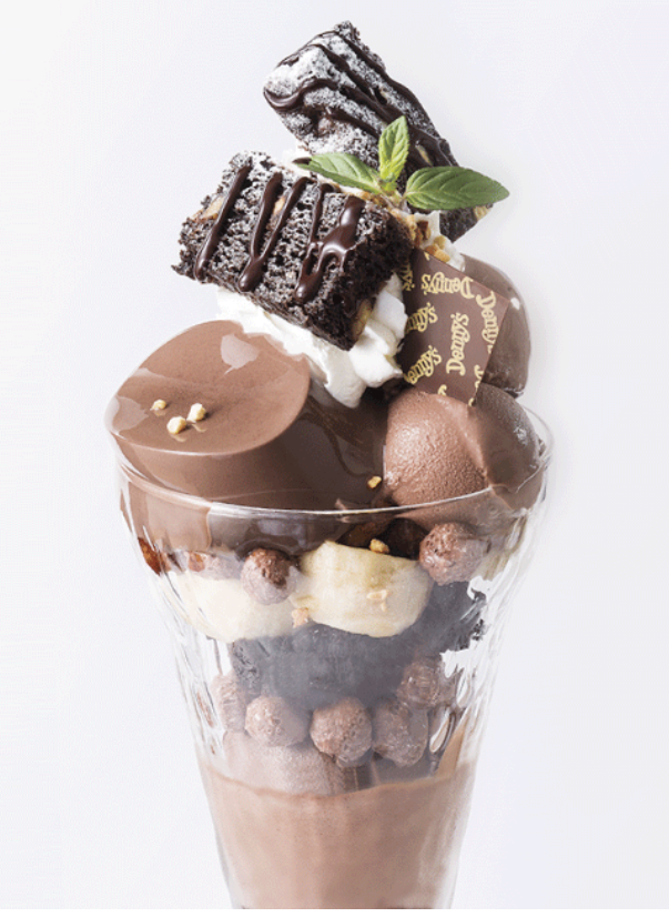 トールグラスにチョコスイーツがぎっしり詰まった「DEVIL’S ブラウニーサンデー」♪チョコアイス、チョコプリン、ココアコーン…そして濃厚なコクとしっとり感がたまらないブラウニー。チョコ好きのハートを離さない、まさに小悪魔のようなデザートです。
