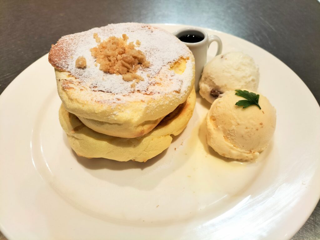 パンケーキを焼く機械に不調があるとのこと+店員不足?で空席はありましたが来店から40分後くらいに食べられました。見るからにおいしそう!!ボリュームがちょうど良く、罪悪感が少ないです。